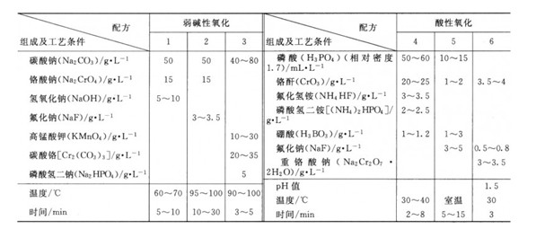 由化學反應生成的膜厚達一定值(0.5~4μm)時,由于膜無松孔,阻礙了溶液與基體金屬的接觸,使膜生長停止,為了保持一定的孔隙,使膜繼續增厚,需向溶液中加入弱酸或弱堿,所以酸和堿是化學氧化成膜的主要成分;再者,為了抑制酸和堿對膜的過度溶解腐蝕,還向溶液中加入氧化劑鉻酐或鉻酸鹽,使膜的生長和溶解保持一定的平衡,以達到較厚的膜層(堿性液中厚度可達到2~39m;酸性溶液中厚度可達到3~4μm)。